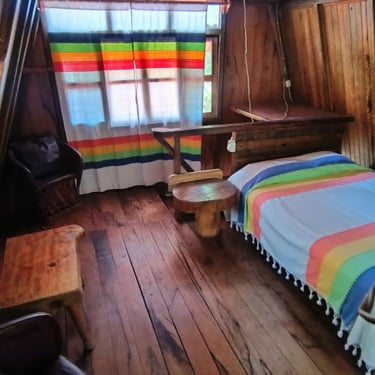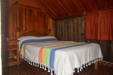 Disfruta del confort de nuestra Cabaña 9 diseñada para 3 personas que cuenta con una cama matrimonial y una individual además de baño privado y ventilador para asegurar un descanso fresco y placentero en el ambiente familiar de Cabañas Don Chico.
