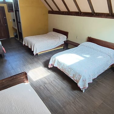 Nuestra Cabaña 6 es el espacio ideal para familias de hasta cuatro integrantes, ofreciendo una cómoda distribución de una cama matrimonial y dos individuales que, junto con su baño privado y ventilador, garantiza una estancia fresca y un descanso placentero en Cabañas Don Chico.